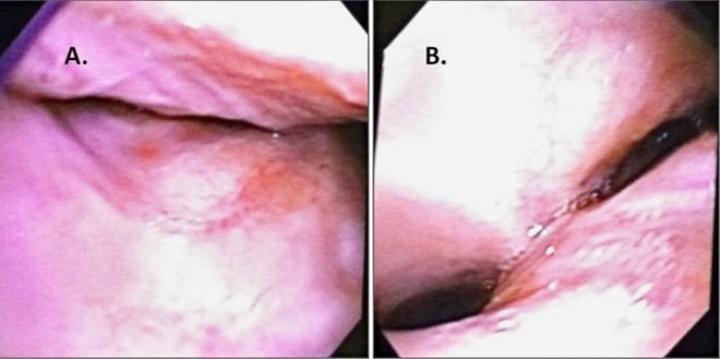 图1. 纤维支气管镜示(A)气管外源性压迫致管腔近乎完全闭塞,(B)双侧主支气管受压[2]