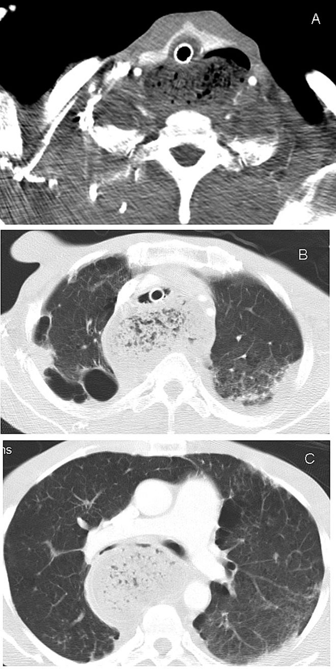 图2. 胸部X线. 胸部CT示食管重度扩张,导致喉部(A)、气管(B)及双侧主支气管(尤其右侧)(C)前向移位伴压迫[2]