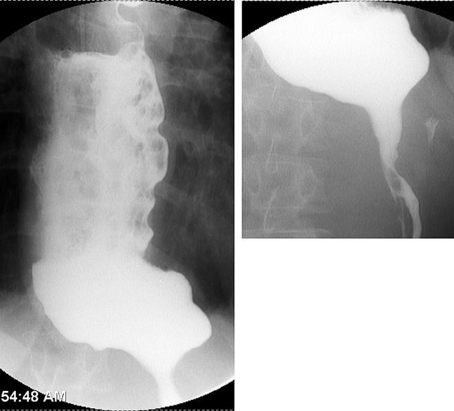 图4. 钡餐造影显示慢性贲门失弛缓症特征:重度扩张的“S型食管”(乙状结肠形),末端逐渐变细呈典型“鸟嘴征”[2]