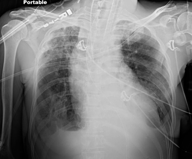 数日后呼吸窘迫再次发作,体格检查闻及喘鸣音伴弥漫性颈部肿胀。直接喉镜下仅可见会厌,虽行气管插管,但经导管调整及吸引后通气仍近乎无效。动脉血气分析(吸纯氧条件下):pH 6.86,PCO₂ 193 mmHg,PO₂ 87 mmHg。