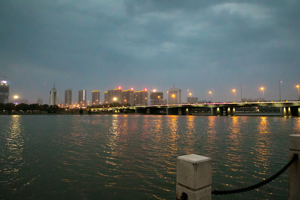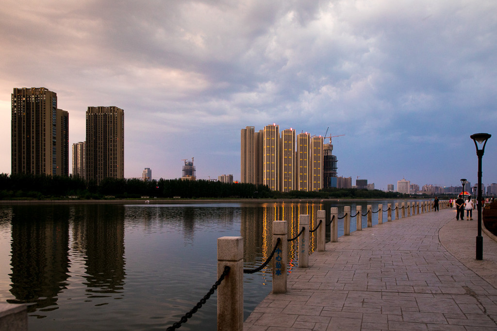 景区湖面上点缀有彩色橡胶坝、大型音乐喷泉、鸟岛、绿洲等,展现出一幅波光潋滟、水天一色的画面。夜幕降临,遍布各分景区的80多种风格各异的7000余盏灯饰与滨河东西路四条光带交相辉映,展现出一幅彩斑斓的立体美景。